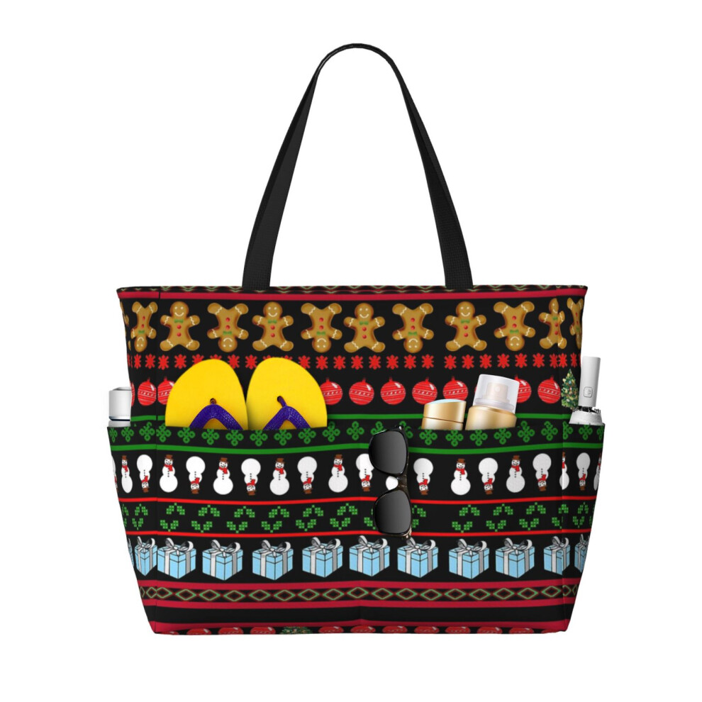 (Adorable Ugly Christmas Sweater Black Background_22305) Beach Bag for Women Large Capacity Waterproof Sandproof Tote with 7 Pockets Pool Zipper Bags