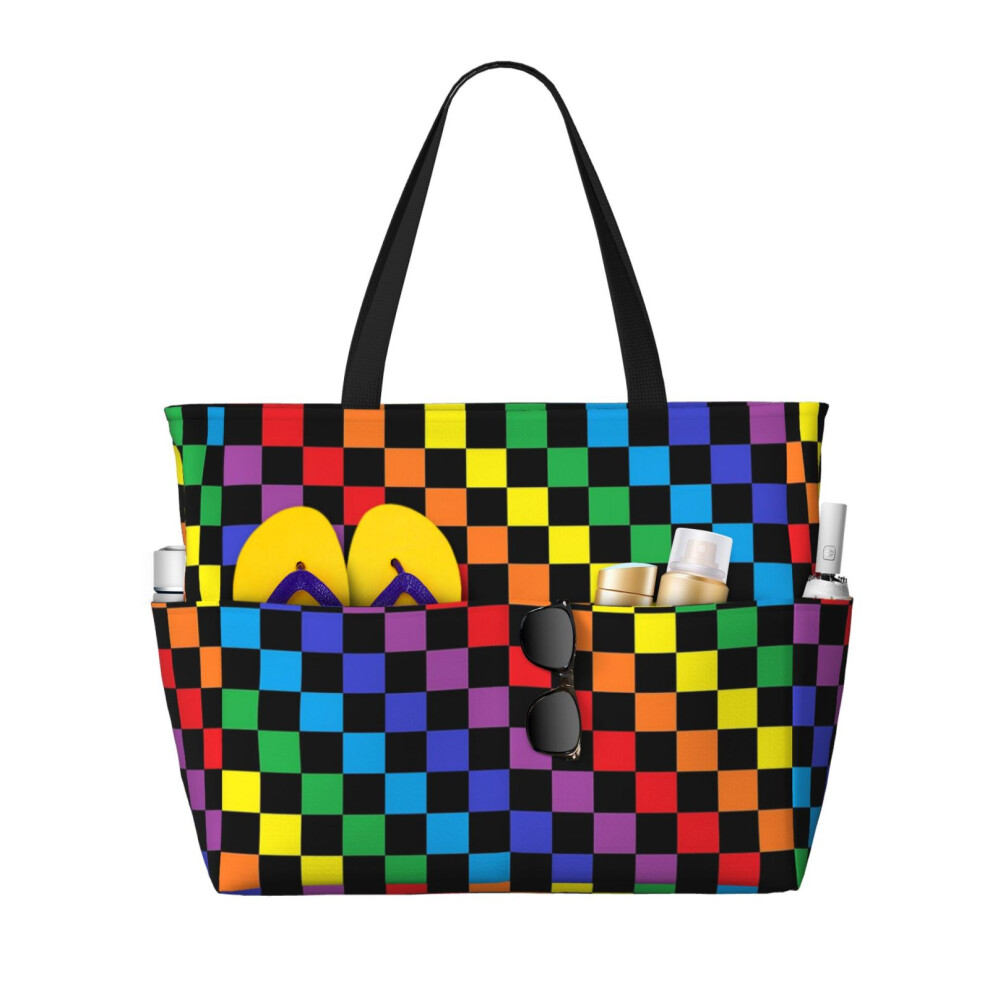 (Checkered Rainbow Black _4664) Beach Bag for Women Large Capacity Waterproof Sandproof Tote with 7 Pockets Pool Zipper Bags for Travel Vacation Gym C