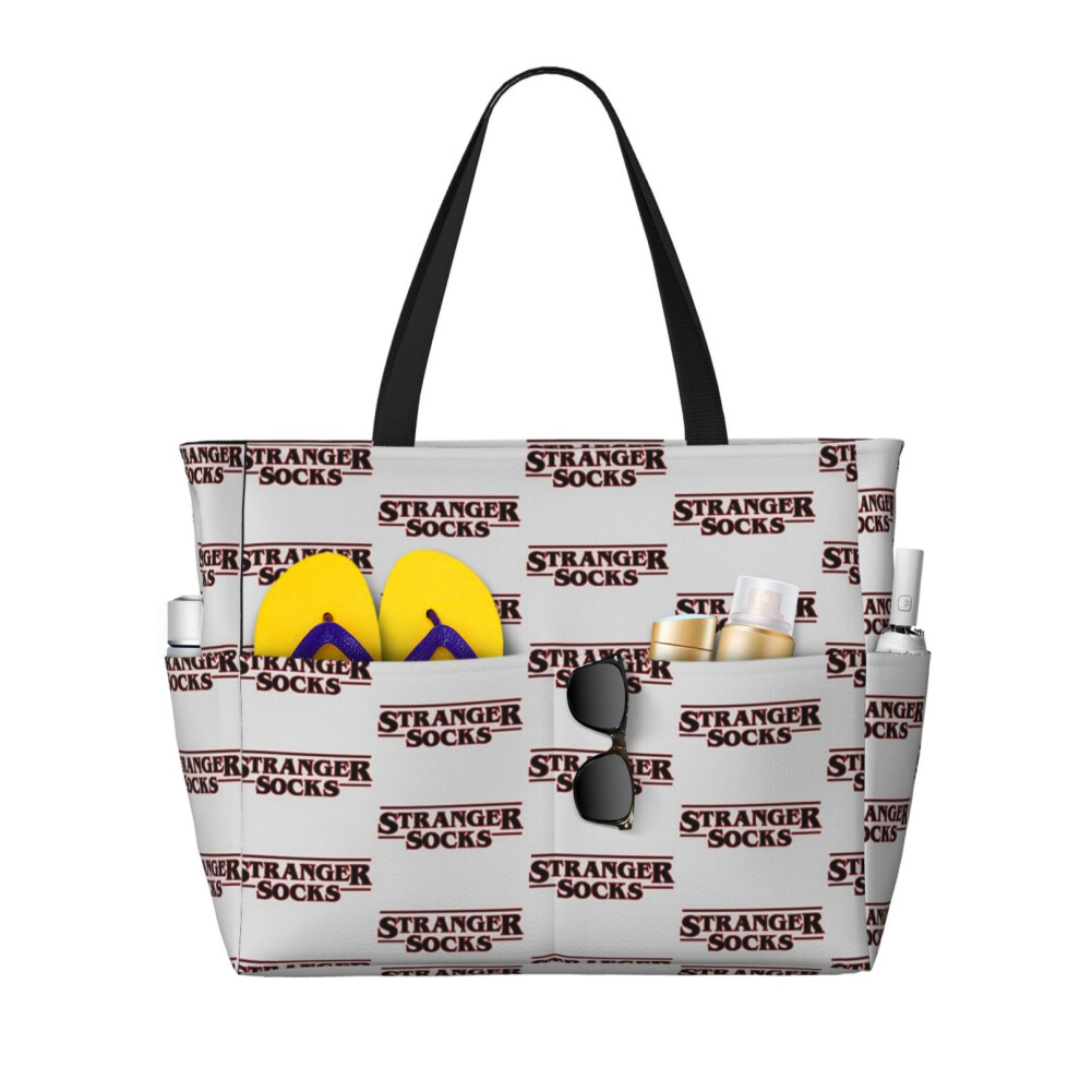 (Stranger Black Red_3823) Beach Bag for Women Large Capacity Waterproof Sandproof Tote with 7 Pockets Pool Zipper Bags for Travel Vacation Gym Camping
