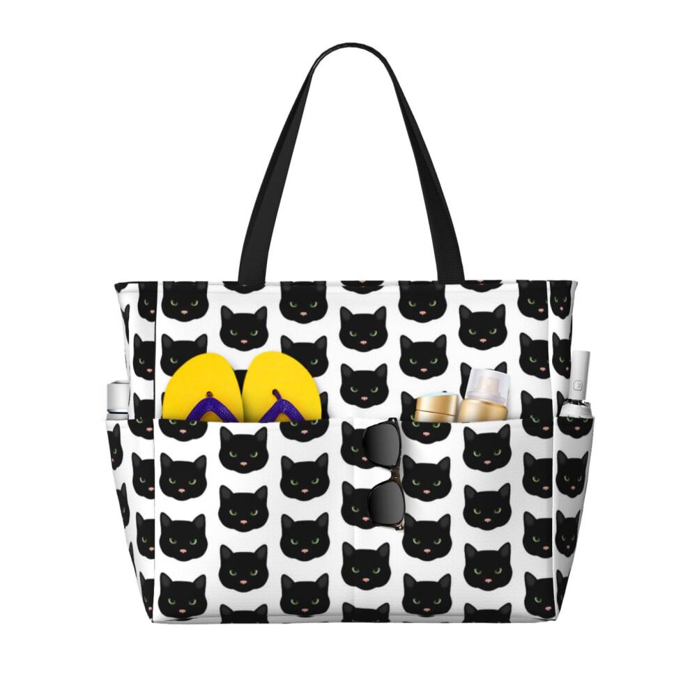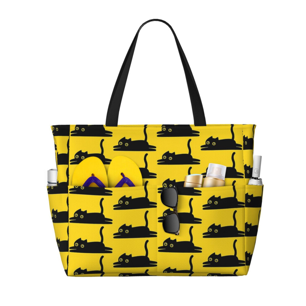 (Black Cat_10252) Beach Bag for Women Large Capacity Waterproof Sandproof Tote with 7 Pockets Pool Zipper Bags for Travel Vacation Gym Camping Shoppin