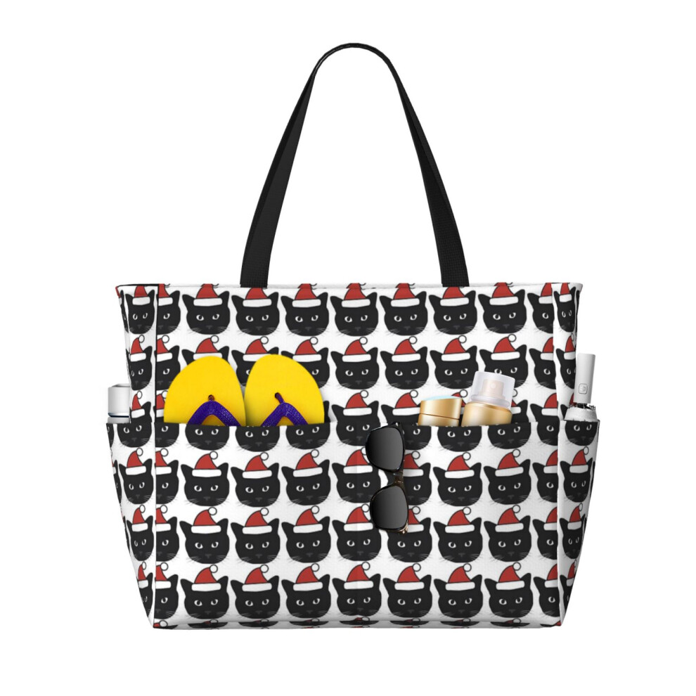 (Christmas Black Cat_22323) Beach Bag for Women Large Capacity Waterproof Sandproof Tote with 7 Pockets Pool Zipper Bags for Travel Vacation Gym Campi