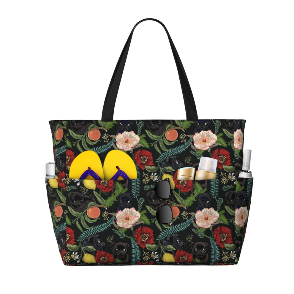 (Botanical And Black Pugs_6221) Beach Bag for Women Large Capacity Waterproof Sandproof Tote with 7 Pockets Pool Zipper Bags for Travel Vacation Gym C