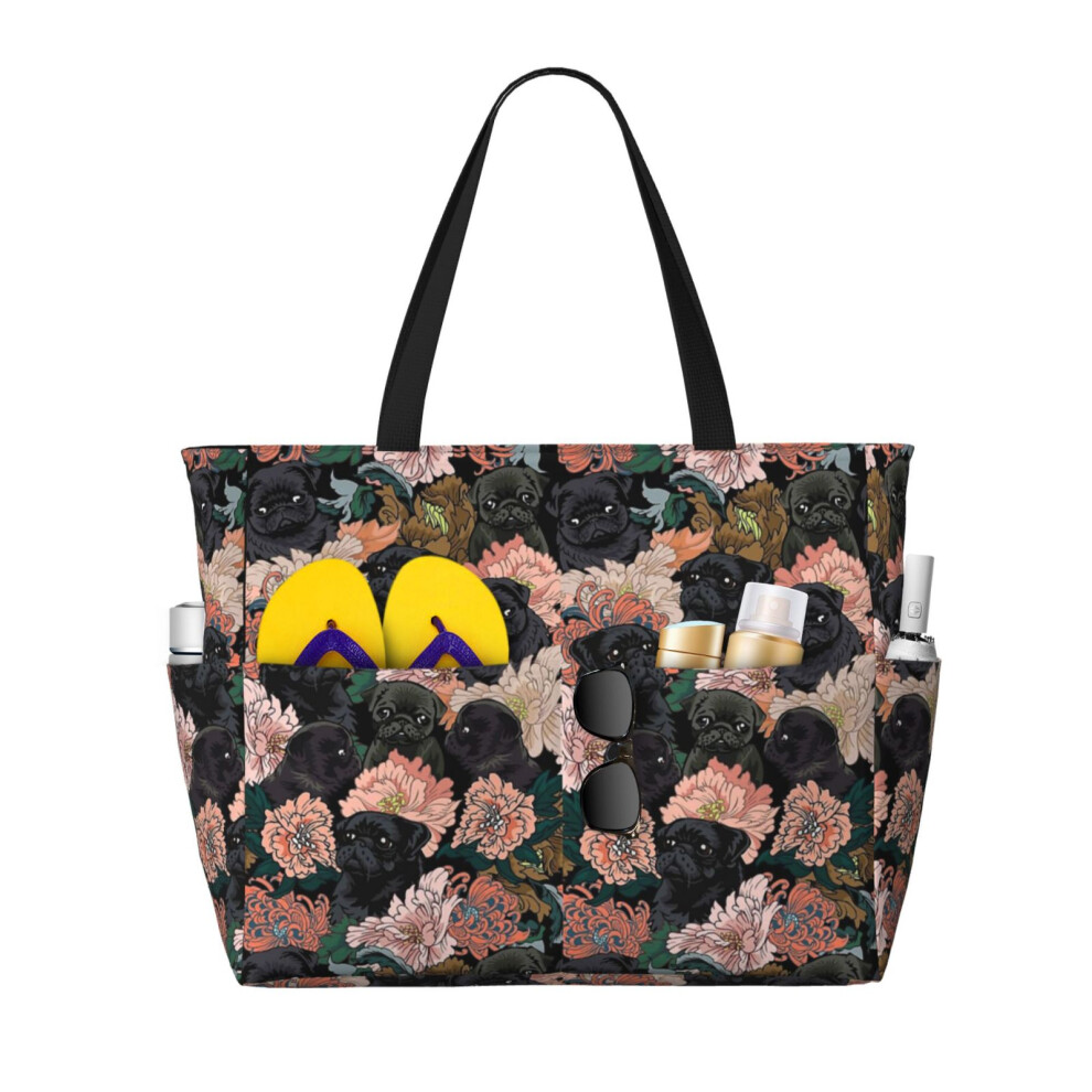 (Black Pugs_6471) Beach Bag for Women Large Capacity Waterproof Sandproof Tote with 7 Pockets Pool Zipper Bags for Travel Vacation Gym Camping Shoppin