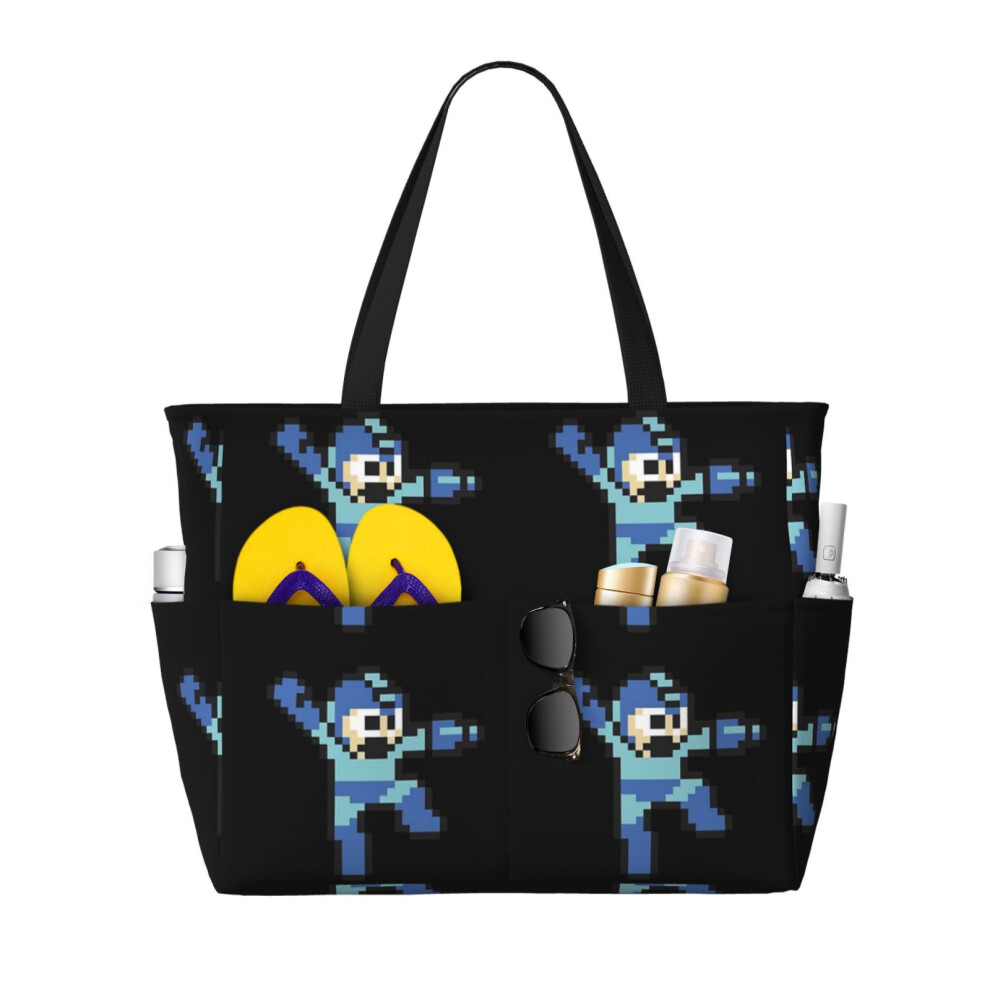 (Megaman Jump'n Shoot - Black _5028) Beach Bag for Women Large Capacity Waterproof Sandproof Tote with 7 Pockets Pool Zipper Bags for Travel Vacation