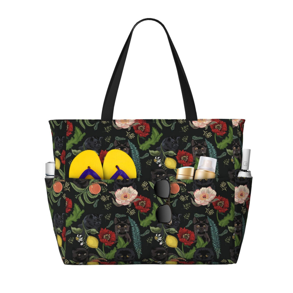 (Botanical And Black Cats_22946) Beach Bag for Women Large Capacity Waterproof Sandproof Tote with 7 Pockets Pool Zipper Bags for Travel Vacation Gym
