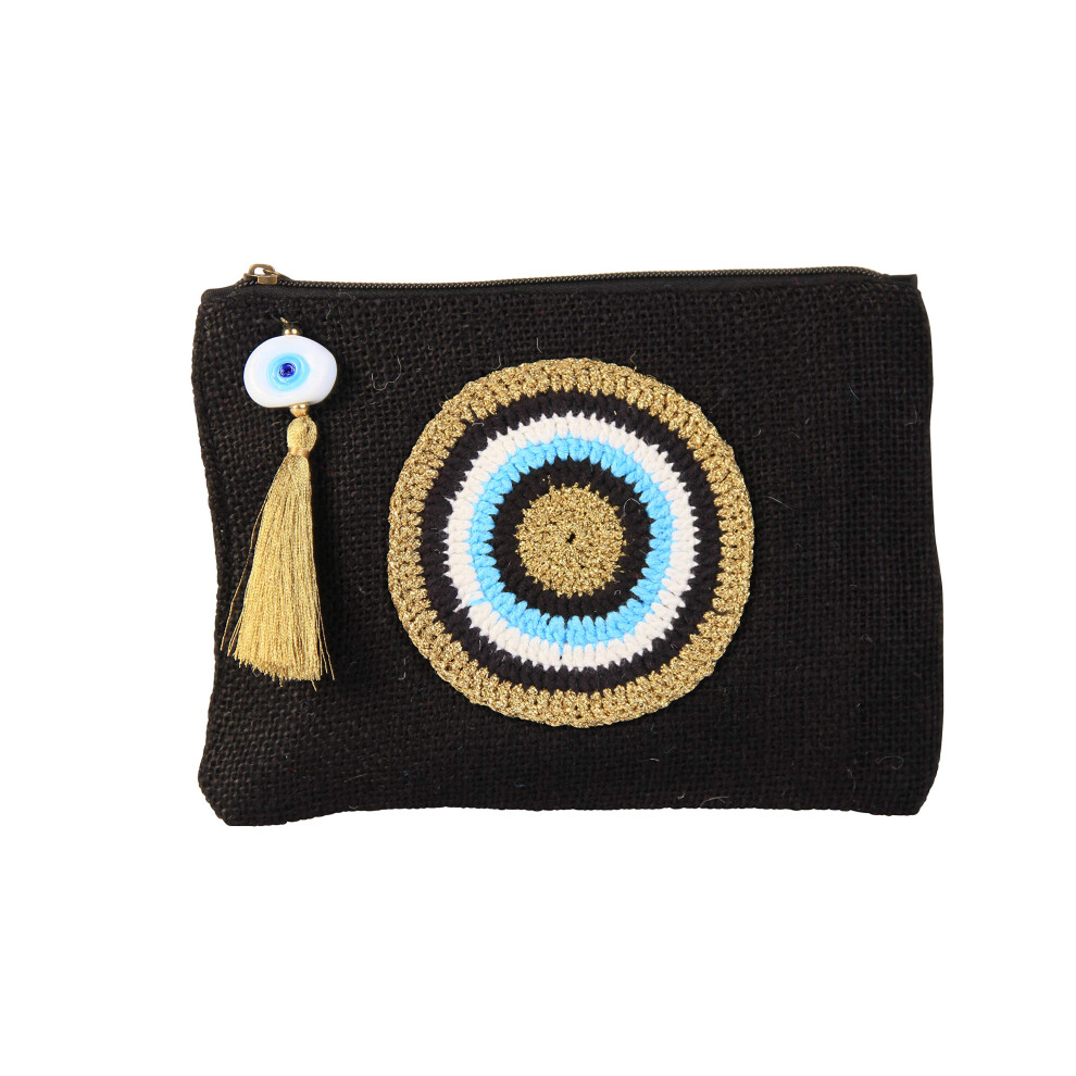 KarensLine Handmade Evil Eye Jute Small Clutch/Pouch Bag Black-Gold Beach Bag Zipper Gift Bag with Tassel