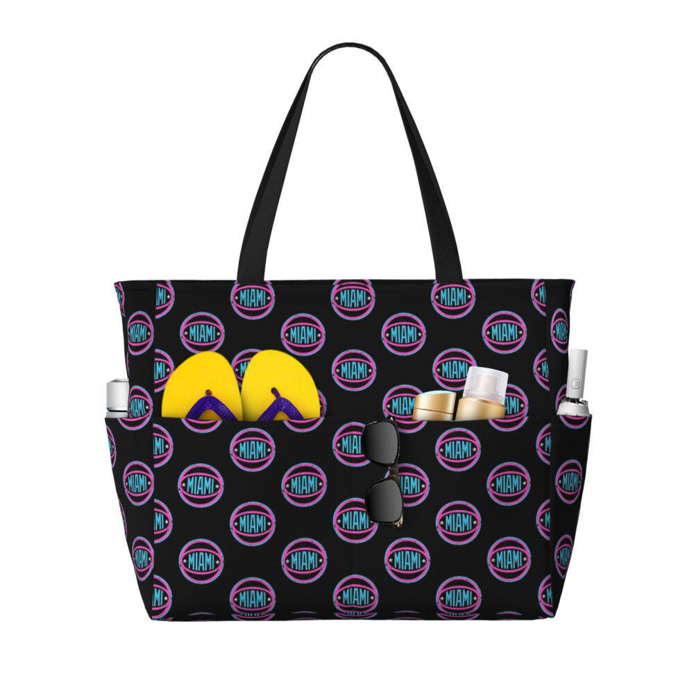 (Miami Retro Ball - Black 2_4099) Beach Bag for Women Large Capacity Waterproof Sandproof Tote with 7 Pockets Pool Zipper Bags for Travel Vacation Gym