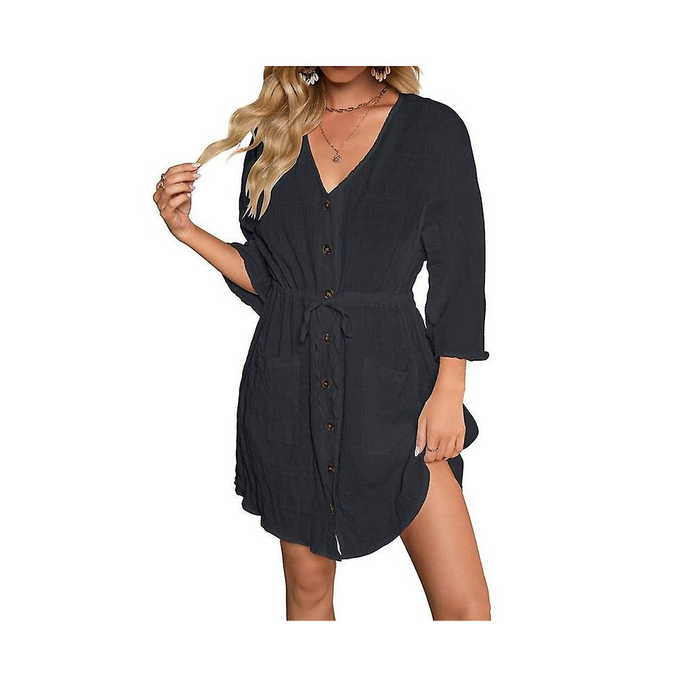 (Black/L) Beach Dress Shirt Cover Up ple Style Long Sleeve Blouse Accessories