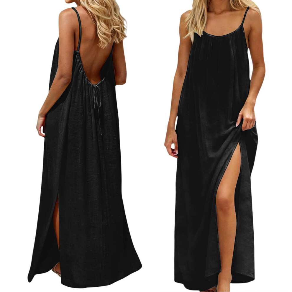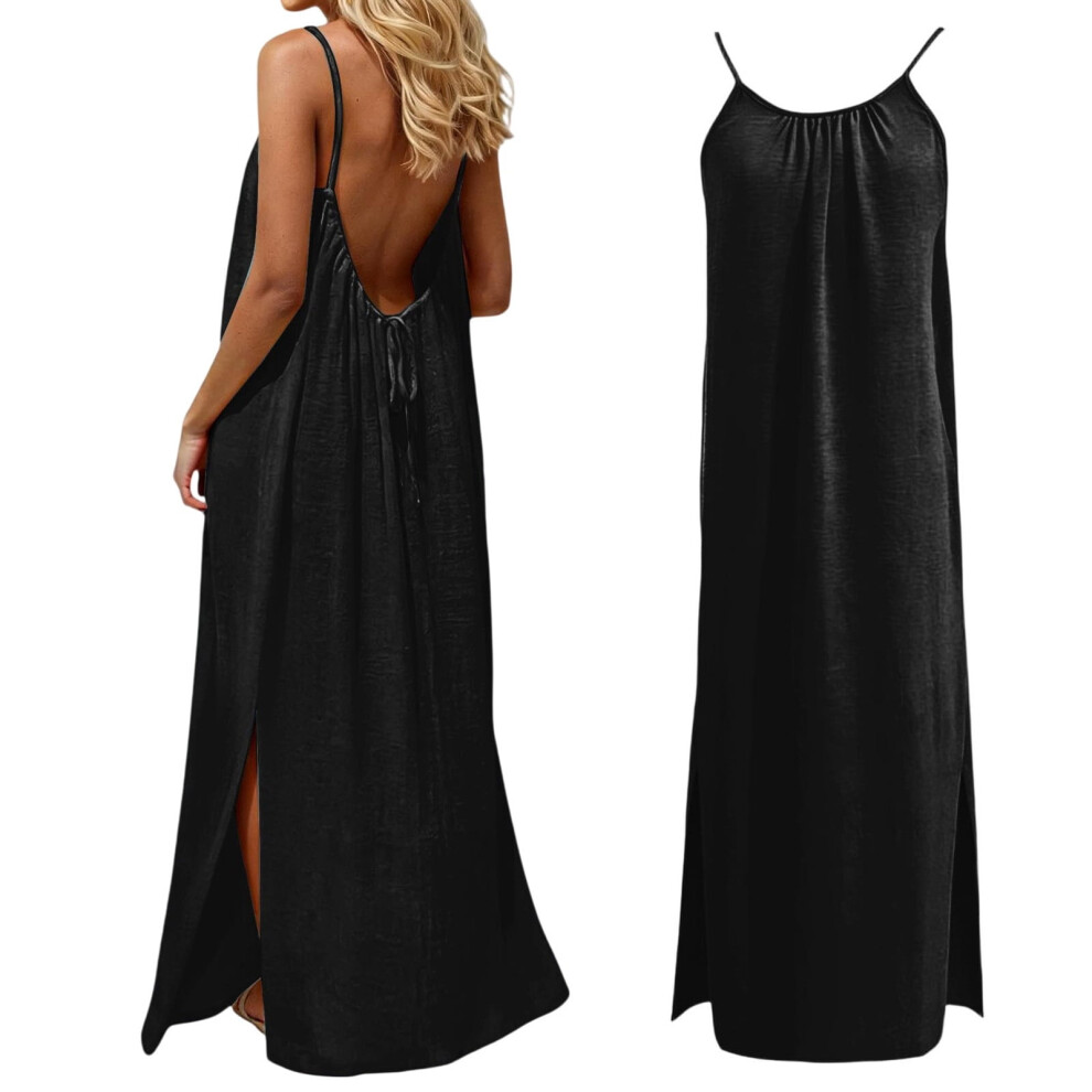 Women's Sleeveless Backless Cami Dress, Split Hem & Spaghetti Strap, Loose Black Summer Beach Dress