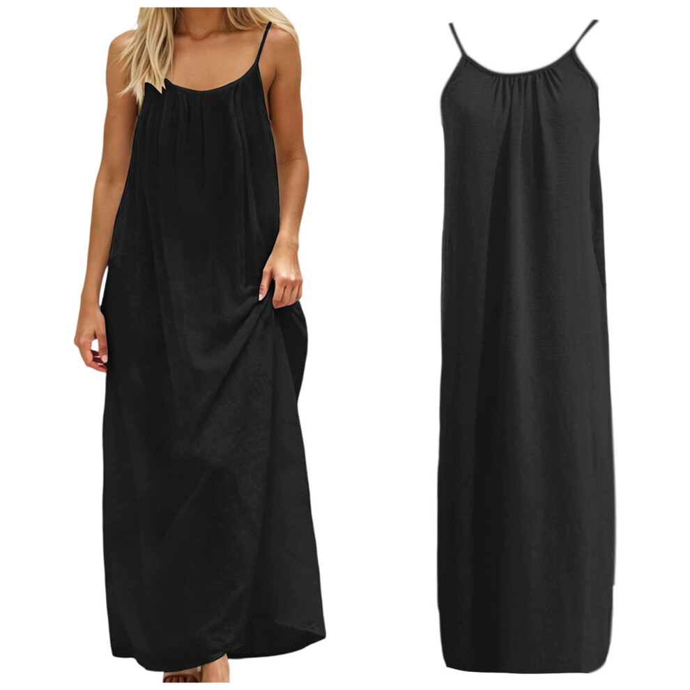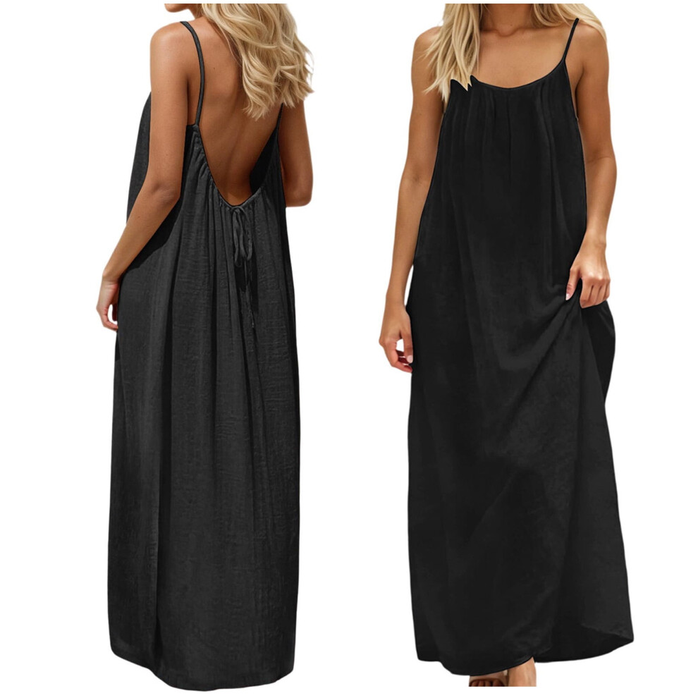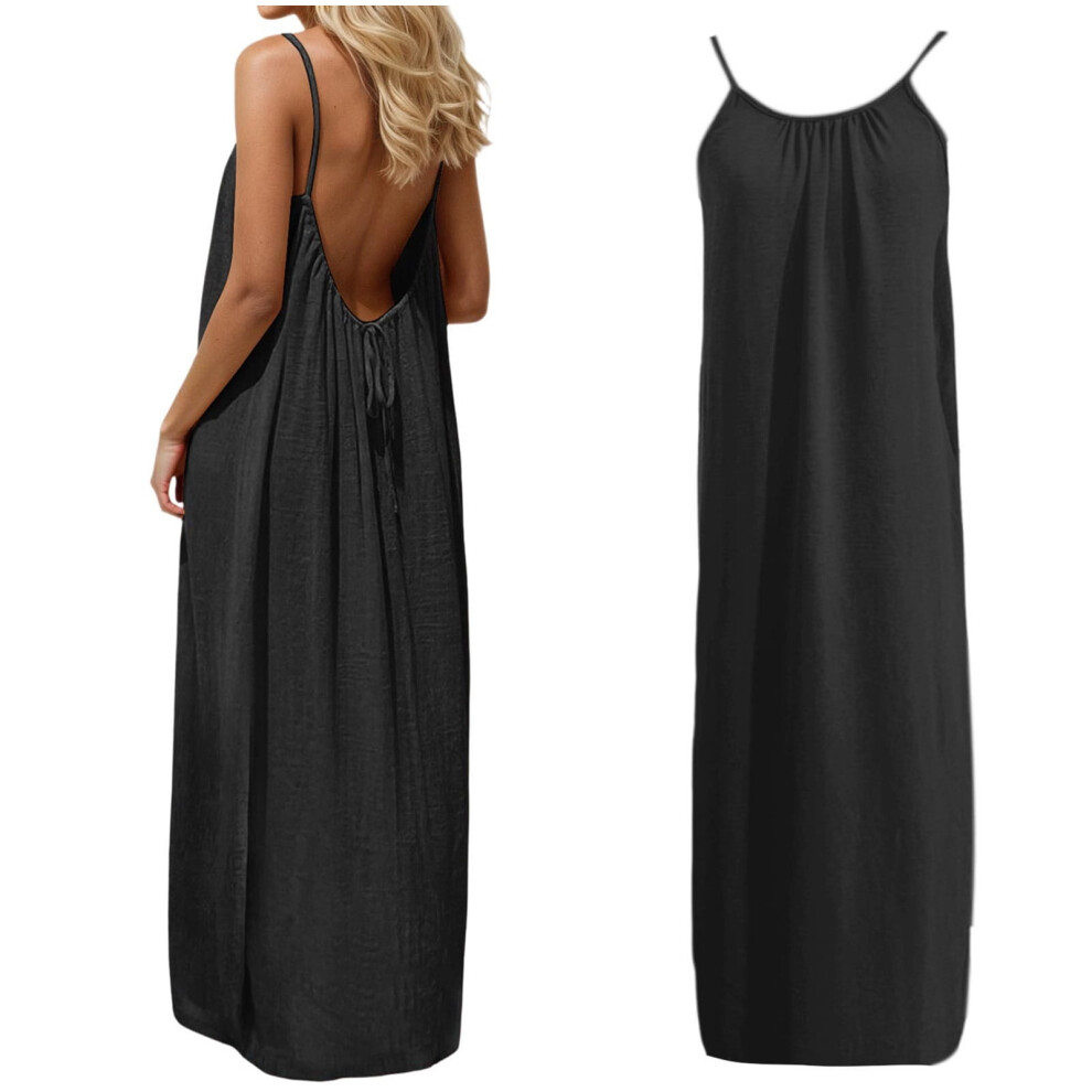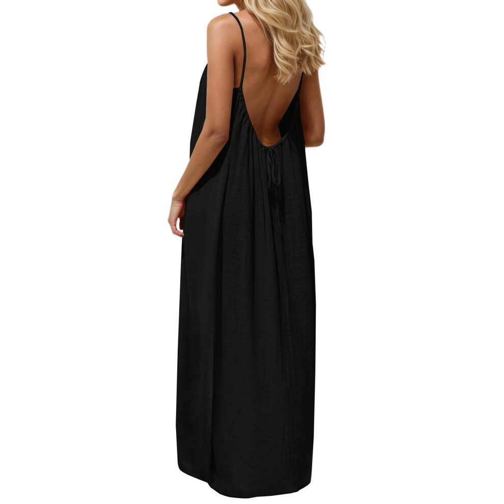 Women's Backless Maxi Dress, Solid Black Sleeveless Beach Dress, Loose Fit Spaghetti Strap Casual Summer Vacation Dress â XXL