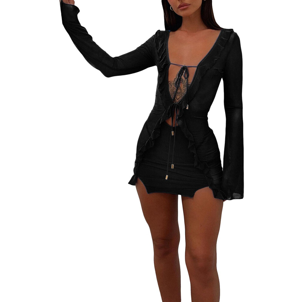 (S, Black) Summer Beach Dress Women Elegant Bandage Ruffles Slim Mini Dress Sexy Blue Long Sleeve Evening Party Dress Club Outfits