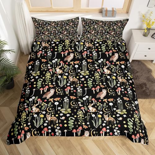 Homewish Black Floral Bedding Double Bed Set for Kids Girls, Microfiber Reversible Duvet Cover Aesthetic Room Decor, Cute Woodland Animal Print Bedding Sets, Rustic Garden Flowers Quilt Cover