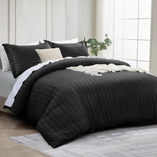 INSPIRE HOMEWARE Double Duvet set - Premium Hotel Quality Reversible Satin Stripes Duvet Cover with 2 Pillowcases, Black Double Bedding Set - Soft Microfiber Quilt Bedding