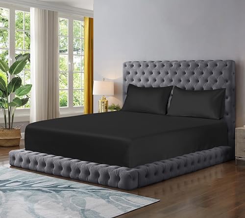 Fitted Sheet 40cm Deep Pocket Bed Sheet Soft Brushed Microfibre Fabric Shrinkage and Fade Resistant Easy Care Bottom Fitted Sheet Bedding (Black, Single)