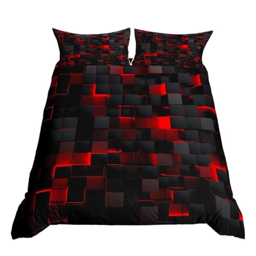 Red And Black Boys Bedding Set Single Size Neon Geometric Checkered Kids Comforter Cover Teen Men Abstract Square Grid Duvet Cover Glowing Plaid Check Bed Set Modern Room Decor