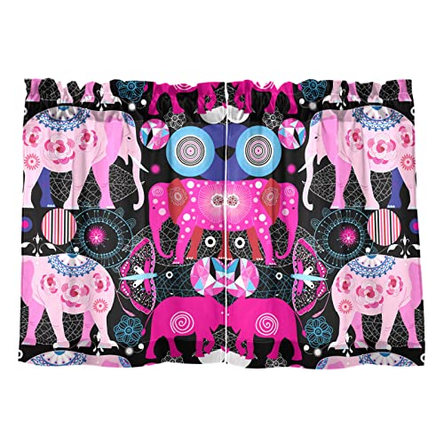 Oyihfvs Seamless Bright Pink Elephants Tribal Ethnic Theme on Black Set of 2 Window Kitchen Curtain, Window Curtain Panel, Bathroom Tier Curtain Sets for Home Living Room Bedroom Decor 27x24 in