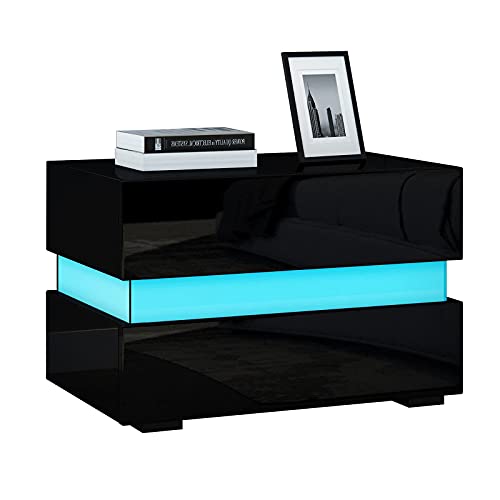 Senvoziii Bedside Table with LED Light Nightstand End Table 2 Drawers and High Gloss Chest of Drawers Bedside Cabinet Table for Bedroom Living Room Black