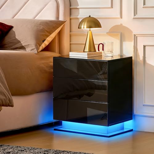 TUKAILAi White Bedside Table with LED Lights, 2/3 Drawers and Top Storage White High Gloss Front Bedside Cabinet Nightstand able for Bedroom Living Room (1, Black, 3 Drawers Style 2)