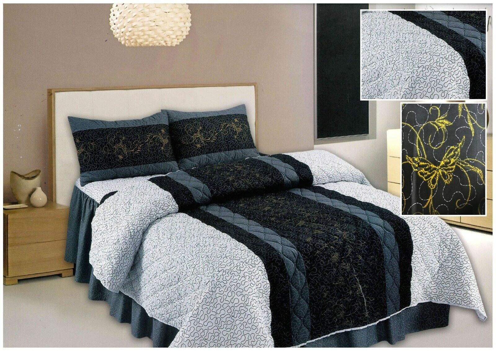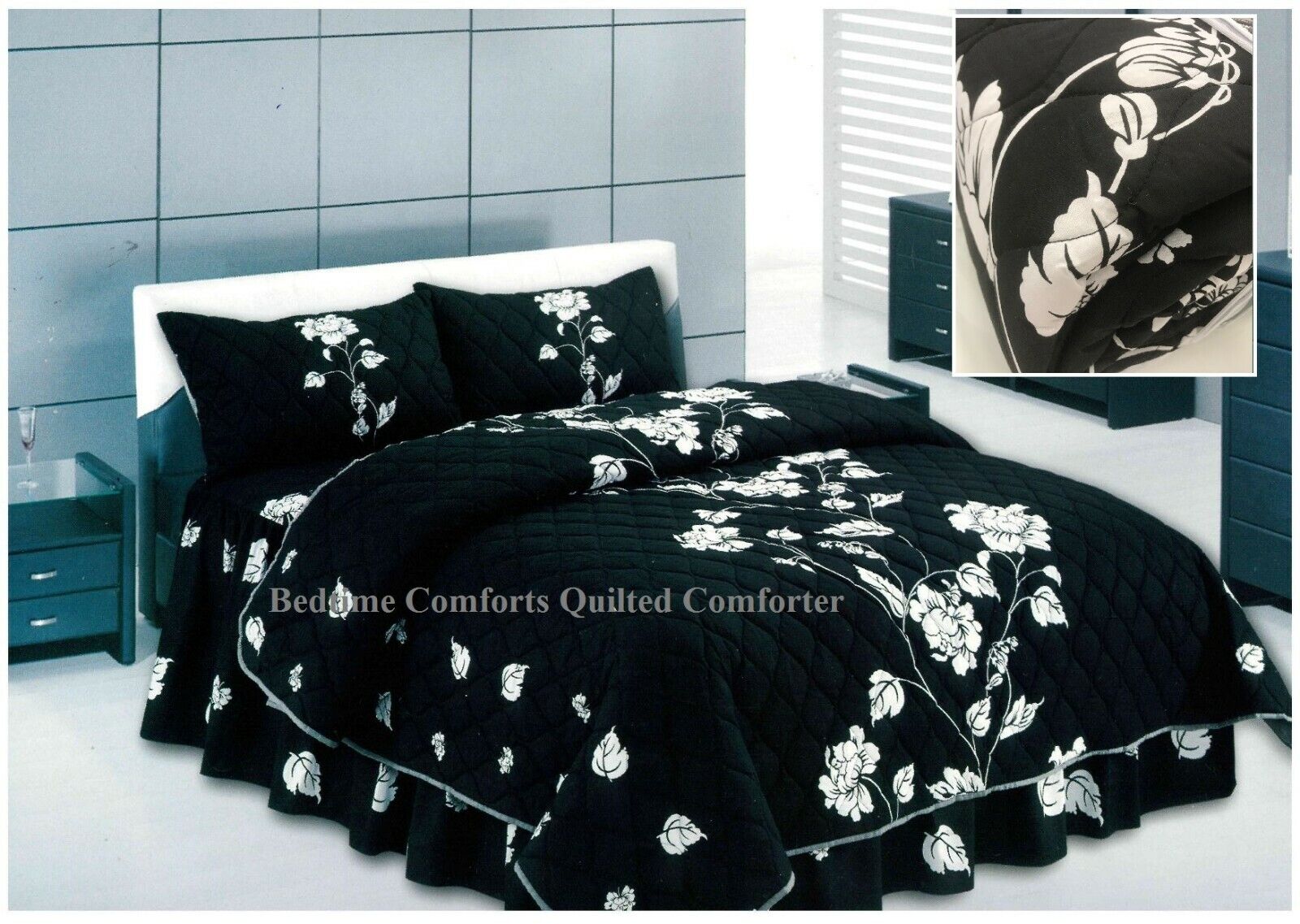 4' 6" DOUBLE LUXURY (3 Pce) "QUILTED" BEDSPREAD COMFORTER (BLACK WHITE) CHARISMA