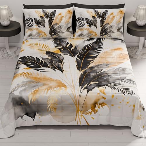 Black Quilt Set Queen Size, Boho Gold Damask Bedspread Coverlet Set Soft Lightweight Microfiber Luxury Bedding Set 3 Pieces for All Season (96"x90")
