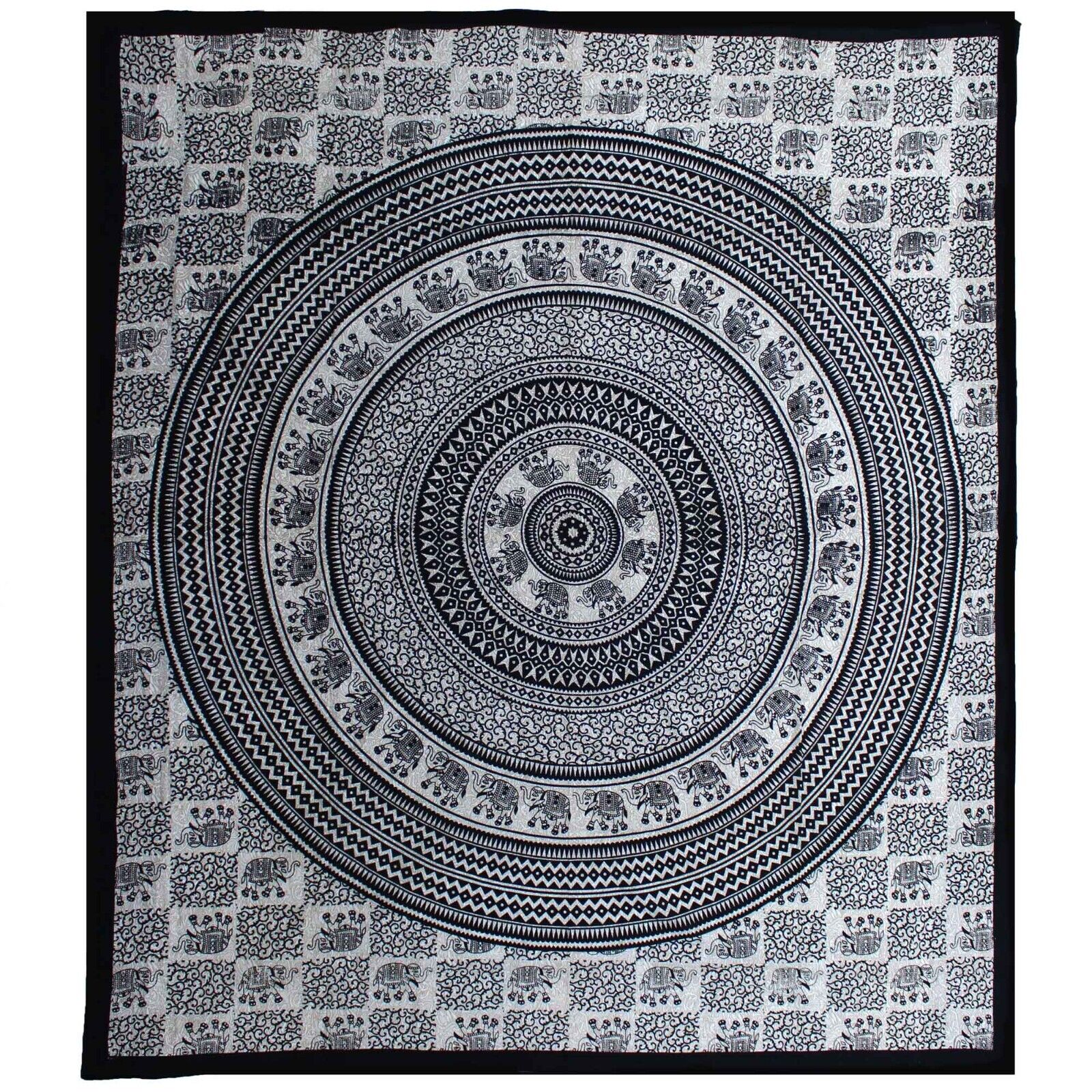Elephant Mandala Black & White Cotton Double Bedspread - Wall Picture Hanging