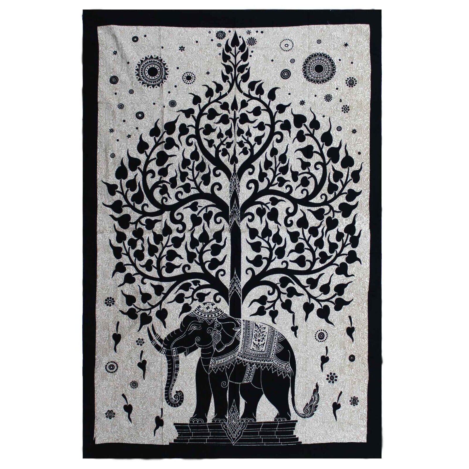 Elephant Tree Black & White Cotton Double Bedspread - Wall Picture Hanging