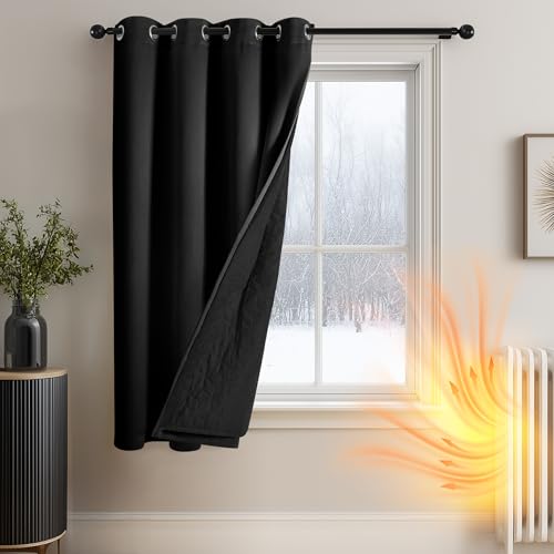 Deconovo Thermal Door Curtains for Winter with Thick Microfiber Quilted Lining, Energy Saving Blackout Curtain Eyelet, Cold Resistant Black Curtain for Bedroom, 52 x 84 Inch, 1 Panel