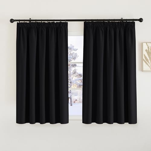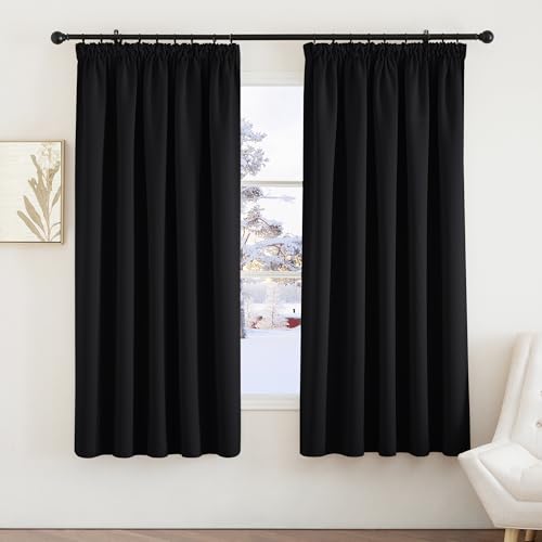 PONY DANCE Blackout Thermal Curtains Black - Short Pencil Pleat Curtain for Bedroom Halloween Decor Thermal Insulated Window Treatments Light Blocking, Room Darkening, 2 Panels, W66 X L54, Black