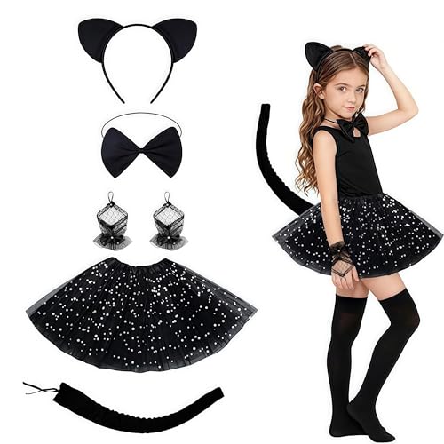 CARxlythic Child Black Cat Costume Set with Tutu skirt, Headband, Bow tie, Gloves and Tail, Cat Cosplay Accessory Kit for Girls, Halloween Dress Up Party, School Role Playing