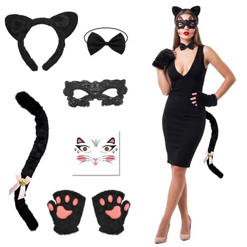 Black Cat Costume for Women, Animal Adult Outfit Accessories with Cat Ears Headband, Mask, Gloves, Tail with Bow, Choker with Bell, Whip and Scratch Tattoos, Halloween & Carnival Fancy Dress Kit