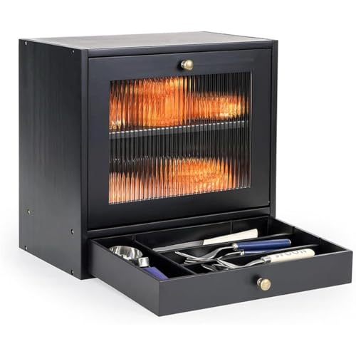 SAYEYBU Bin 2 Layer Wooden Bread Storage Bread Box Holder, Bread Box for Kitchen Countertop, Large Capacity Container Bread Organizer, Farmhouse Keeper Shelf with Drawer Acrylic Window,Black