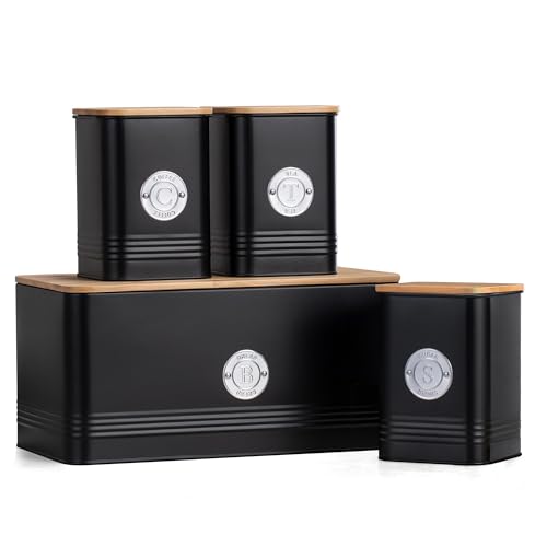 Black Bread Bin Tea Coffee Sugar Storage Tins Canisters Set – Biscuit Barrel Round Jar Canisters Set with Airtight Bamboo Lids, Stylish and Durable Metal Storage Solution for Modern Organized Kitchen