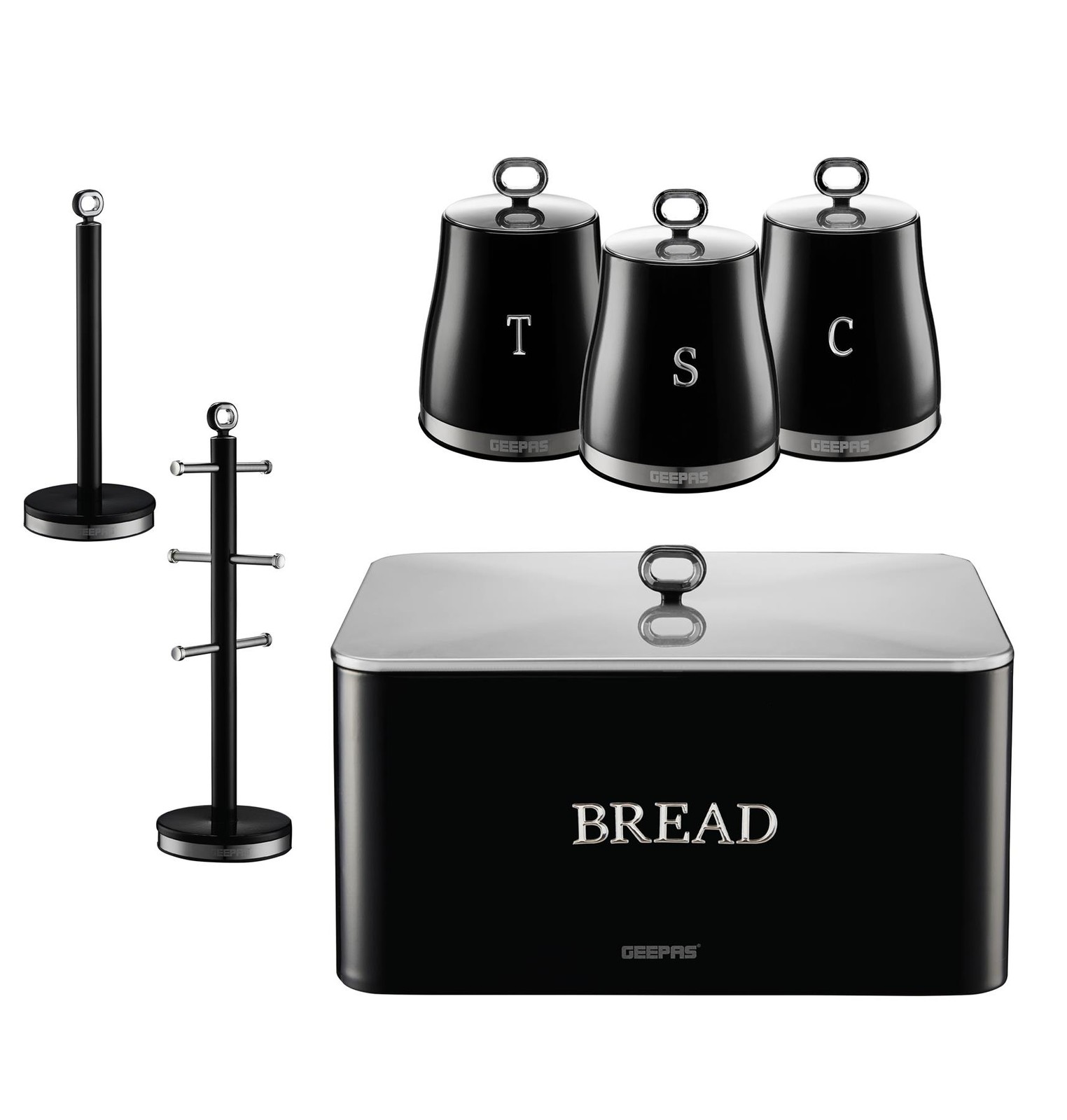 GEEPAS 6 Pc Tea Coffee Sugar Canister Bread Bin Mug Tree & Towel Pole Set Black