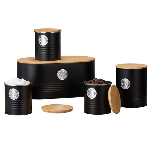 EHC Set of 5 Tea, Sugar, Coffee, Biscuit & Bread Bin Canisters Set With Airtight Lid, Kitchen Storage Jars with Lids, Containers Canisters Jars Set of 5, Black