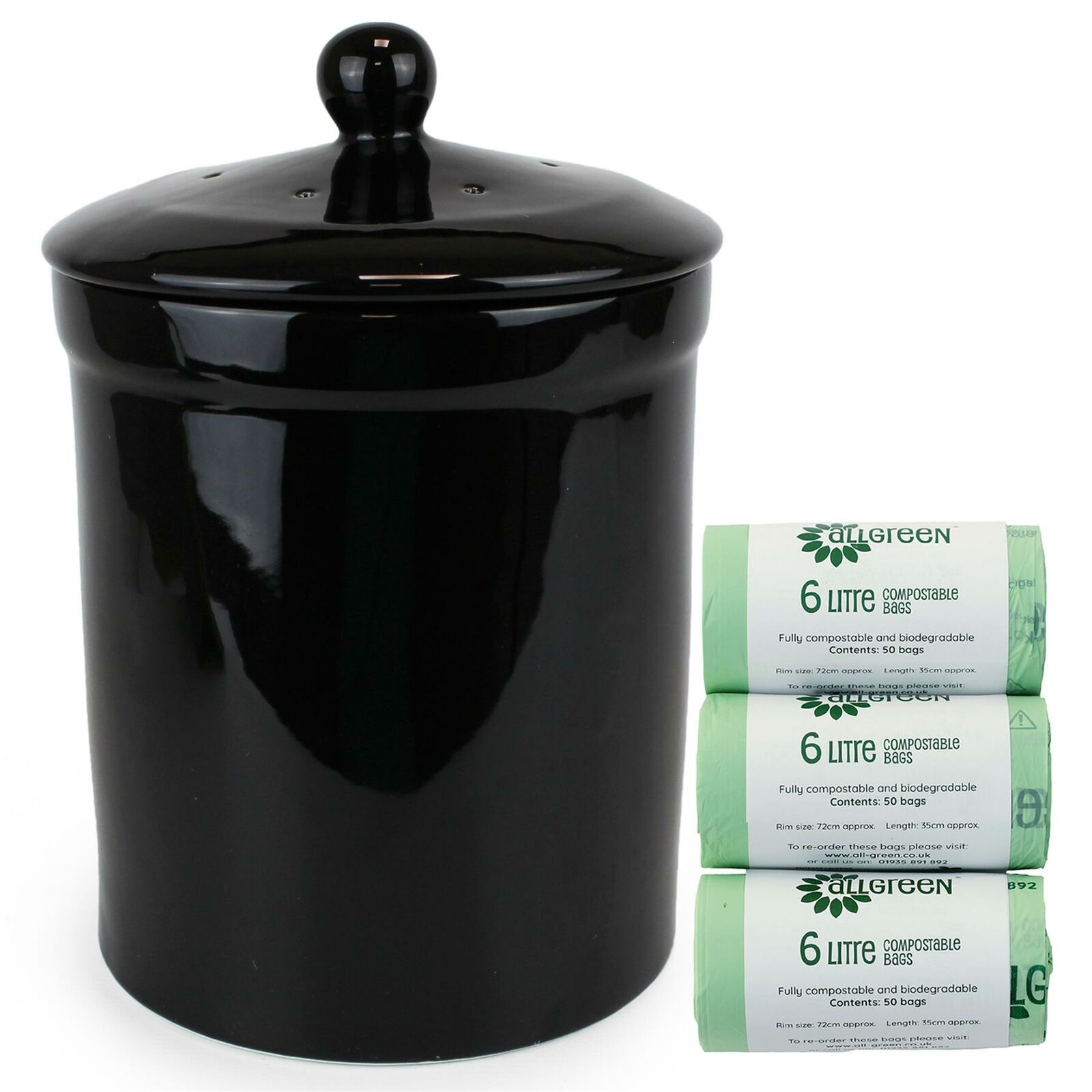 Portland Ceramic Compost Caddy/Food Waste Bin - Black & 50x 6L All-Green Bags