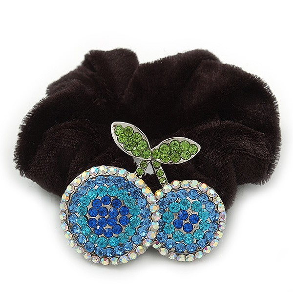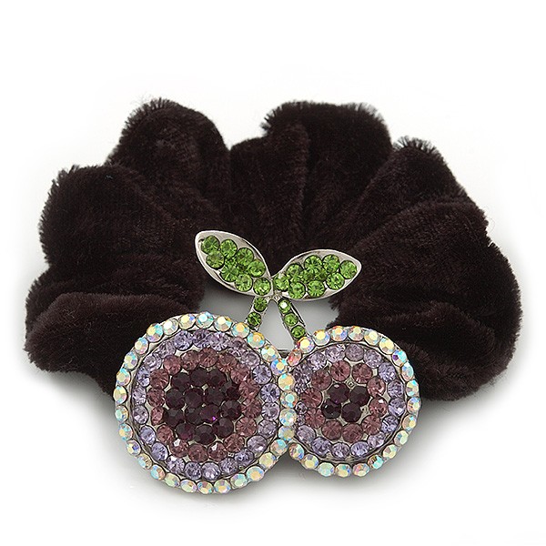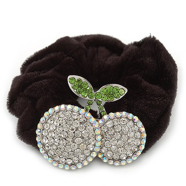 Rhodium Plated Swarovski Crystal 'Double Cherry' Pony Tail Black Hair Scrunchie
