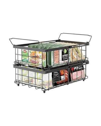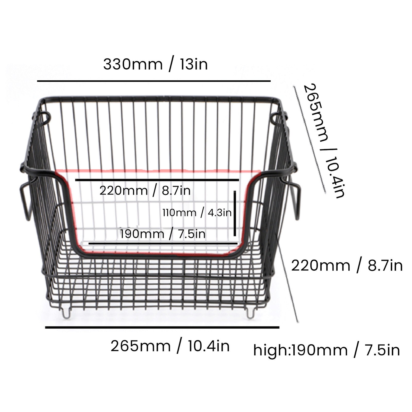 UMDONX 2 Pack Expandable Chest Freezer Basket Organiser Storage Boxes with Foldable Handle, Stackable Wire Containers Kitchen Pantry Shelf Rack, Durable Metal Black Load 25KG