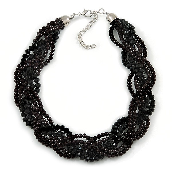 Luxurious Braided Black Bead Choker Necklace In Silver Plating - 36cm