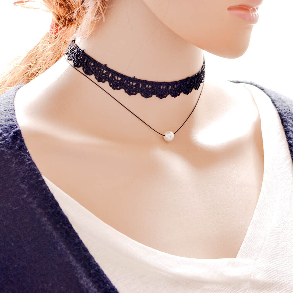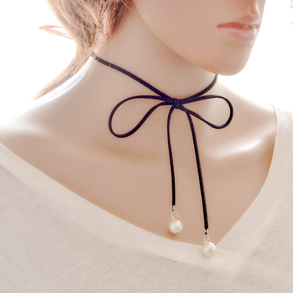 Black Suede Lace Choker Necklace With White Pearl Shaped Pendant Charm