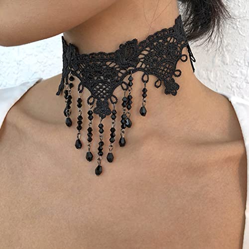 Handcess Black Lace Choker Necklace Rhinestone Tassel Necklaces Gothic Hollow Flower Collar Jewelry Accessories for Women.