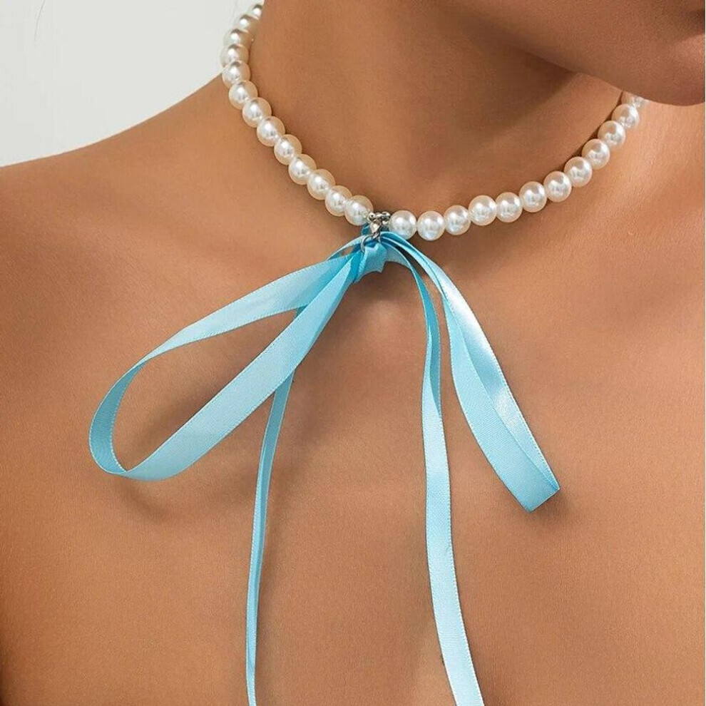 (blue) Trend Wedding Party Jewelry Long Black Ribbon Choker Necklace For Women Elegant White Imitation Pearl Beach Vacation Necklaces