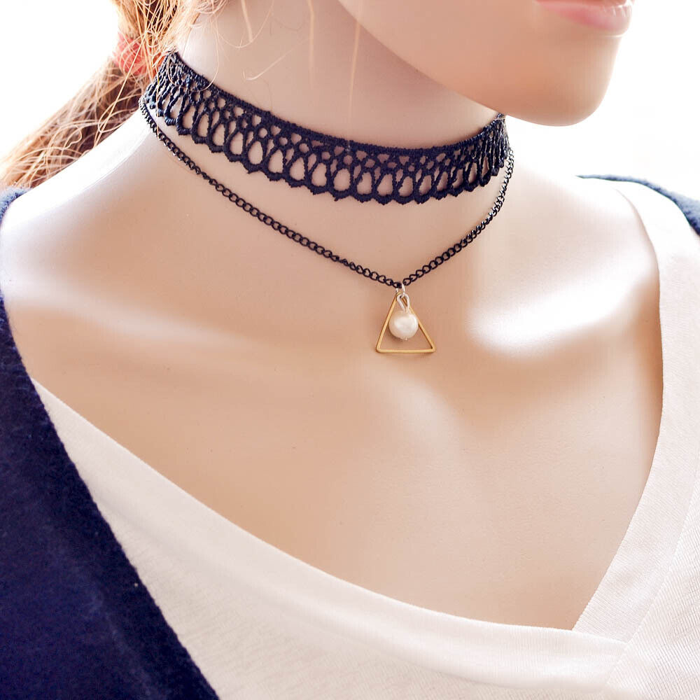 Black Suede Lace Choker Necklace With Triangle White Pearl Shaped Pendant Charm