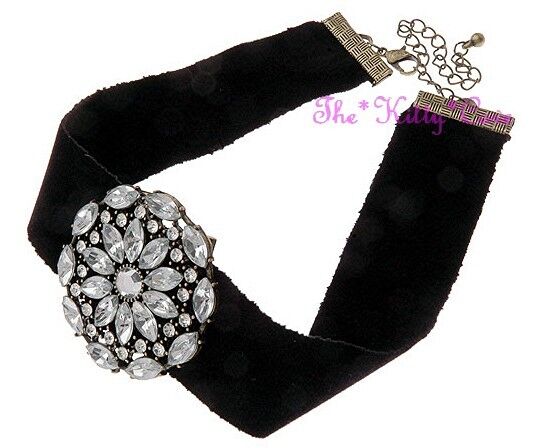 Retro Fashion Black Suede Lace Choker Necklace With Rhinestone Pendants Charm