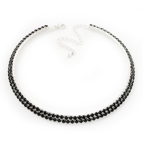 2-Row Jet Black Austrian Crystal Choker Necklace (Silver Plated)