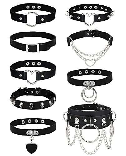 JeweBella 9PCS Gothic Choker Necklace Set for Women PU Leather Necklace Set Punk Chain Black Necklace Choker Rock Spike Leather Choker Necklace Love Heart Choker Adjustable