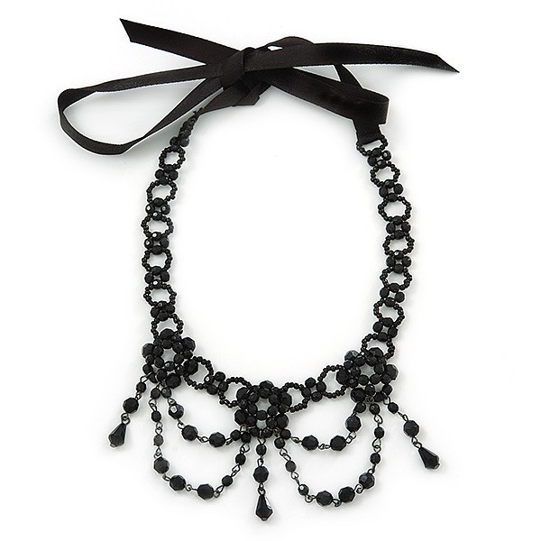 Victorian Style Black Bead Choker Necklace With Black Silk Ribbon - Adjustable