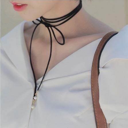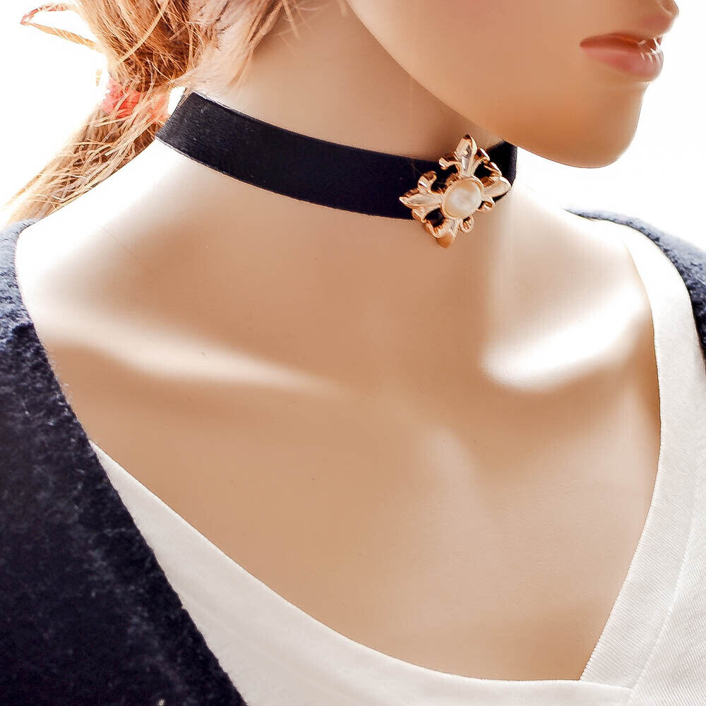 Retro Style Black Suede Choker Necklace With White Pearl Shaped Pendant Charm