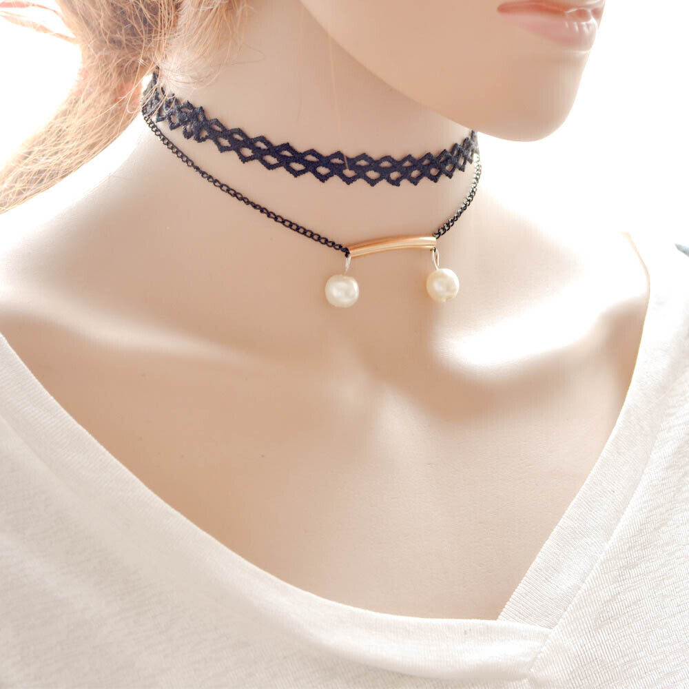 Black Suede Lace Choker Necklace With Double White Pearl Shaped Pendant Charm