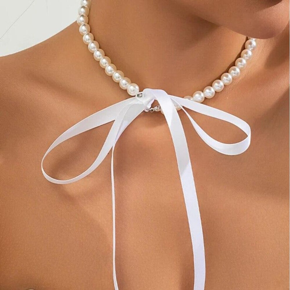 (white) Trend Wedding Party Jewelry Long Black Ribbon Choker Necklace For Women Elegant White Imitation Pearl Beach Vacation Necklaces
