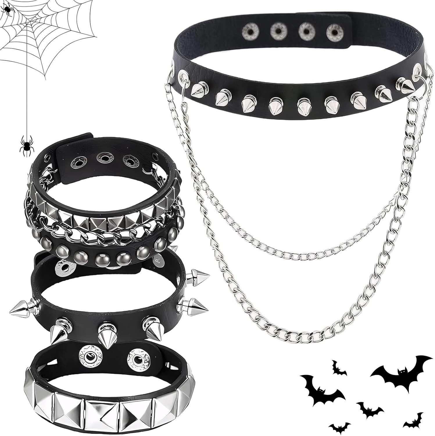 Black Studded Choker,4 Pcs Punk Black Leather Choker Necklace and Rock Leather Bracelets Set,Metal Gothic Necklace,Spiked Bracelet,Punk Accessories Adjustable PU Leathers Chain Collar for Women Men